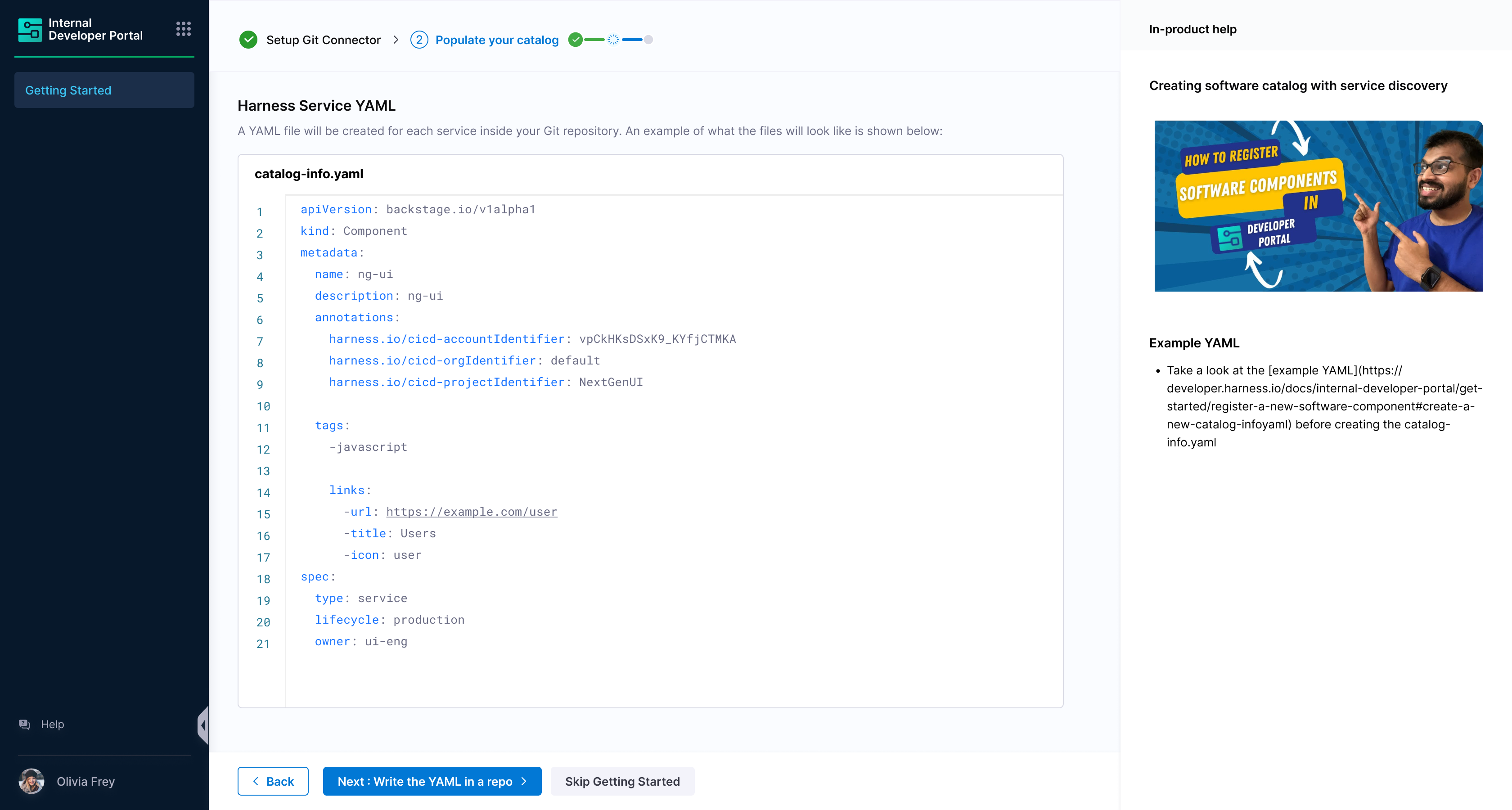 • Since during the onboarding flow Harness will not be able to discover the complete metadata of the entity, the owner field will be set to Unknown. As part of the IDP provisioning, Harness users and groups are imported to IDP. With this in place, customers can start editing the catalog info YAML definition to update the owner for each of the entity.